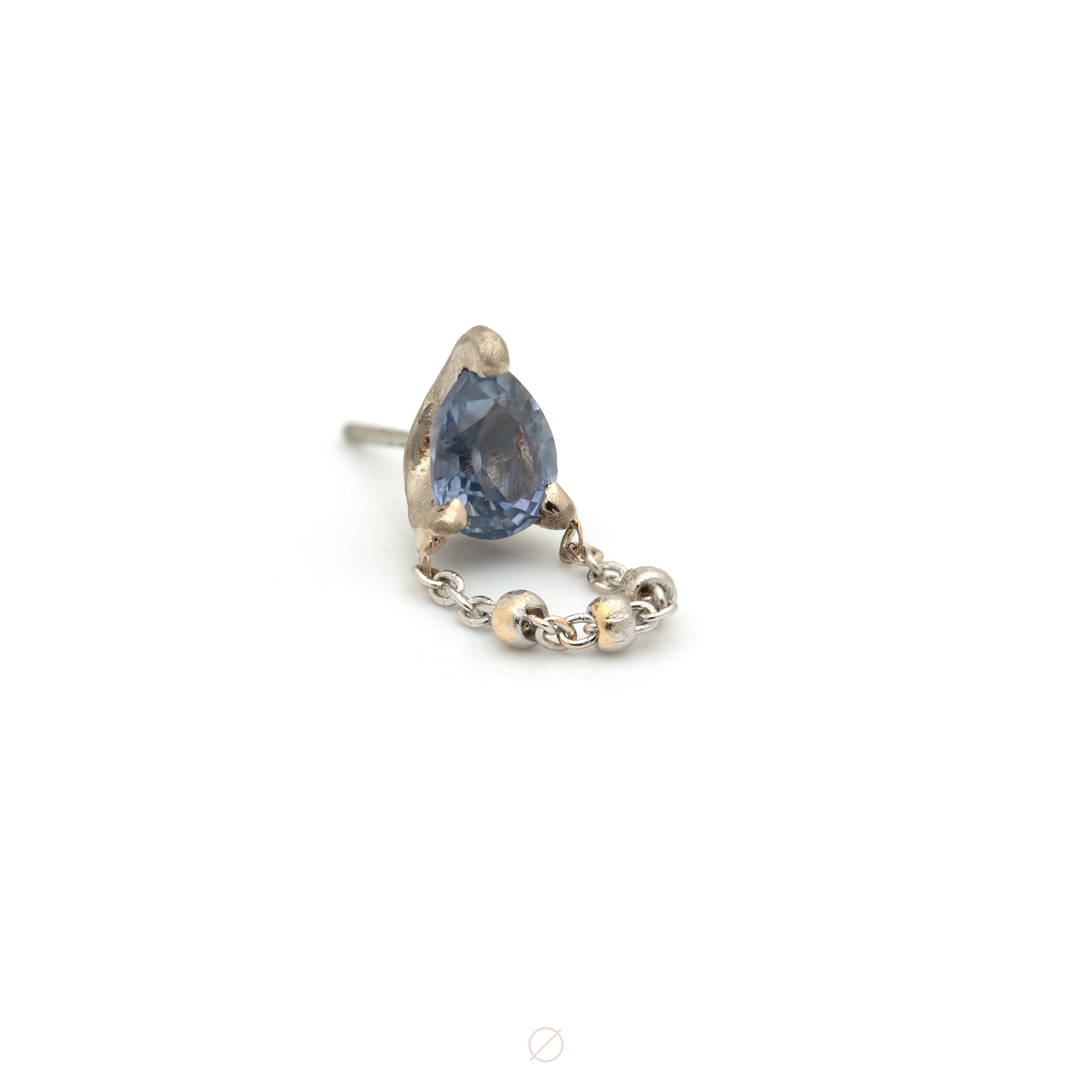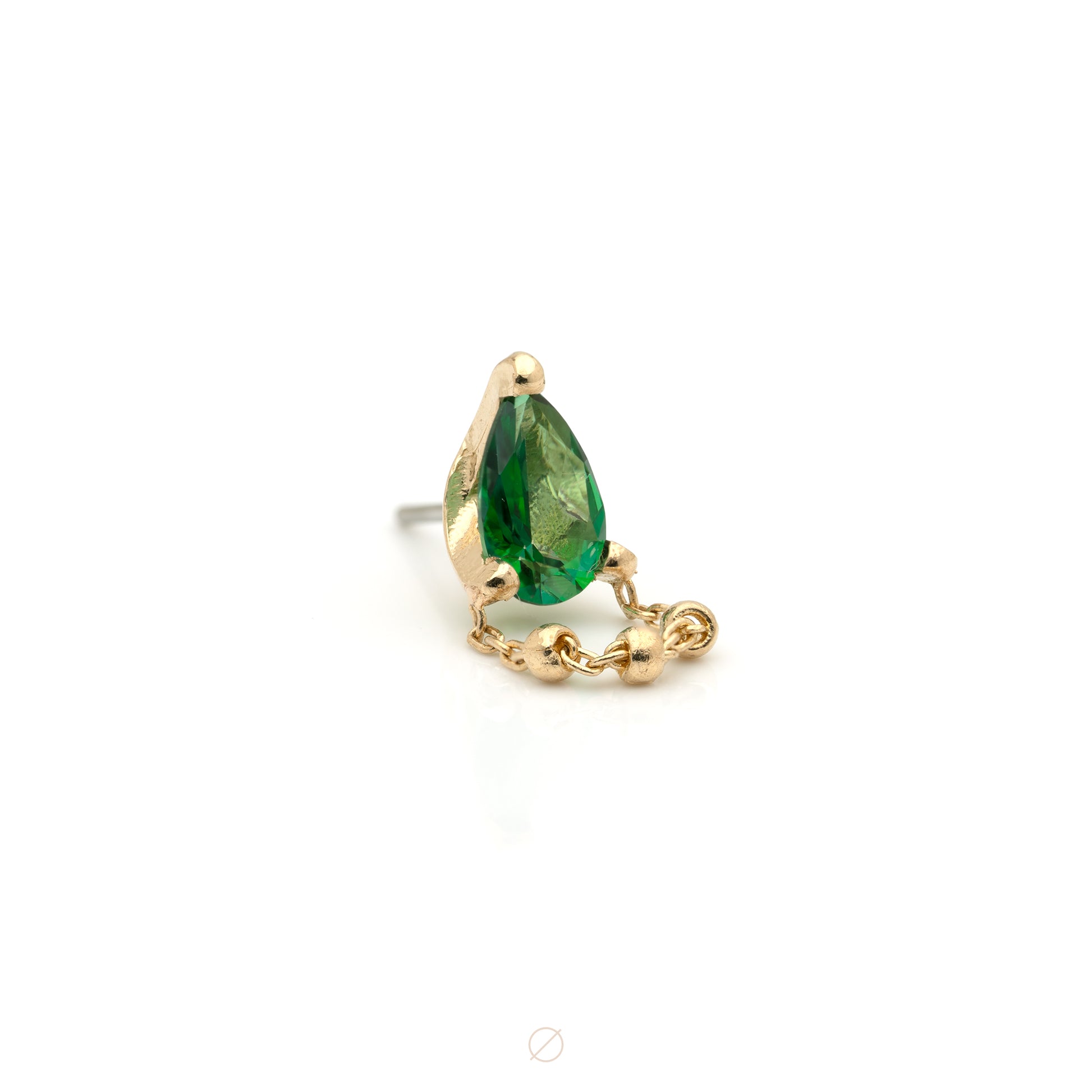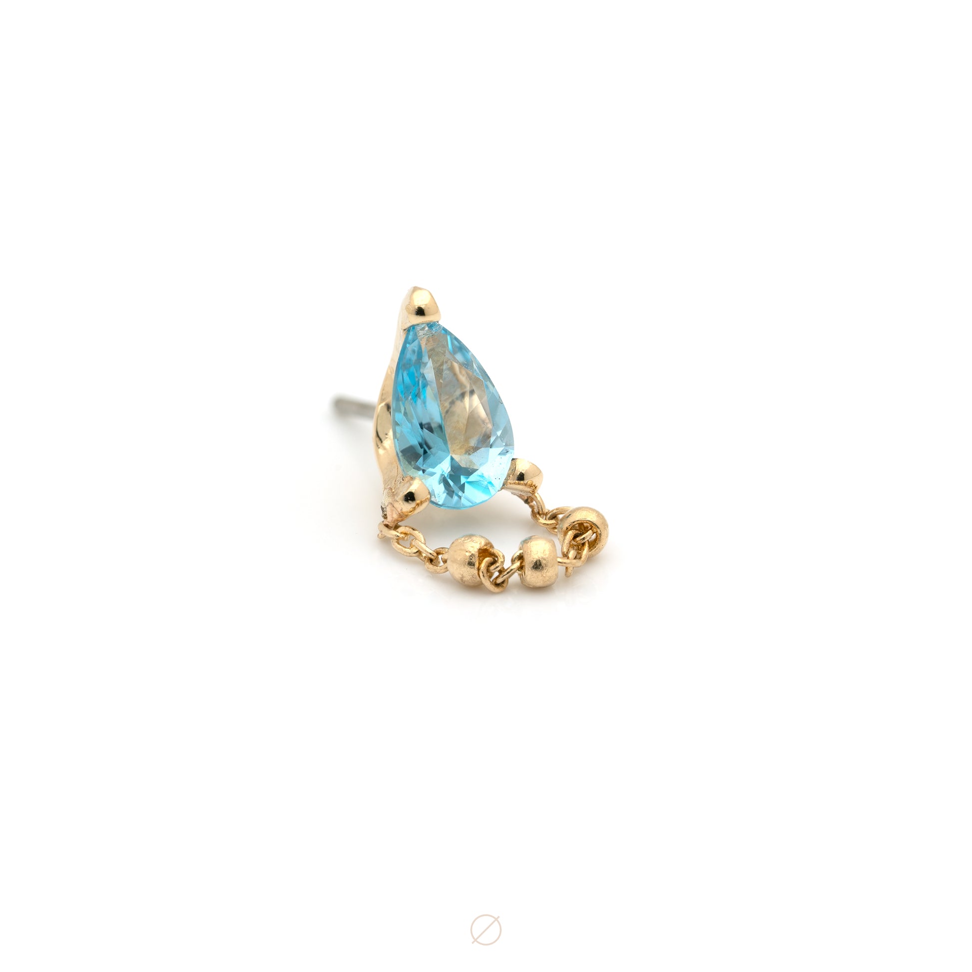 This stunning pear cut gemstone is set in three prongs and is accentuated with a dainty trio beaded chain that drips to form a loop.