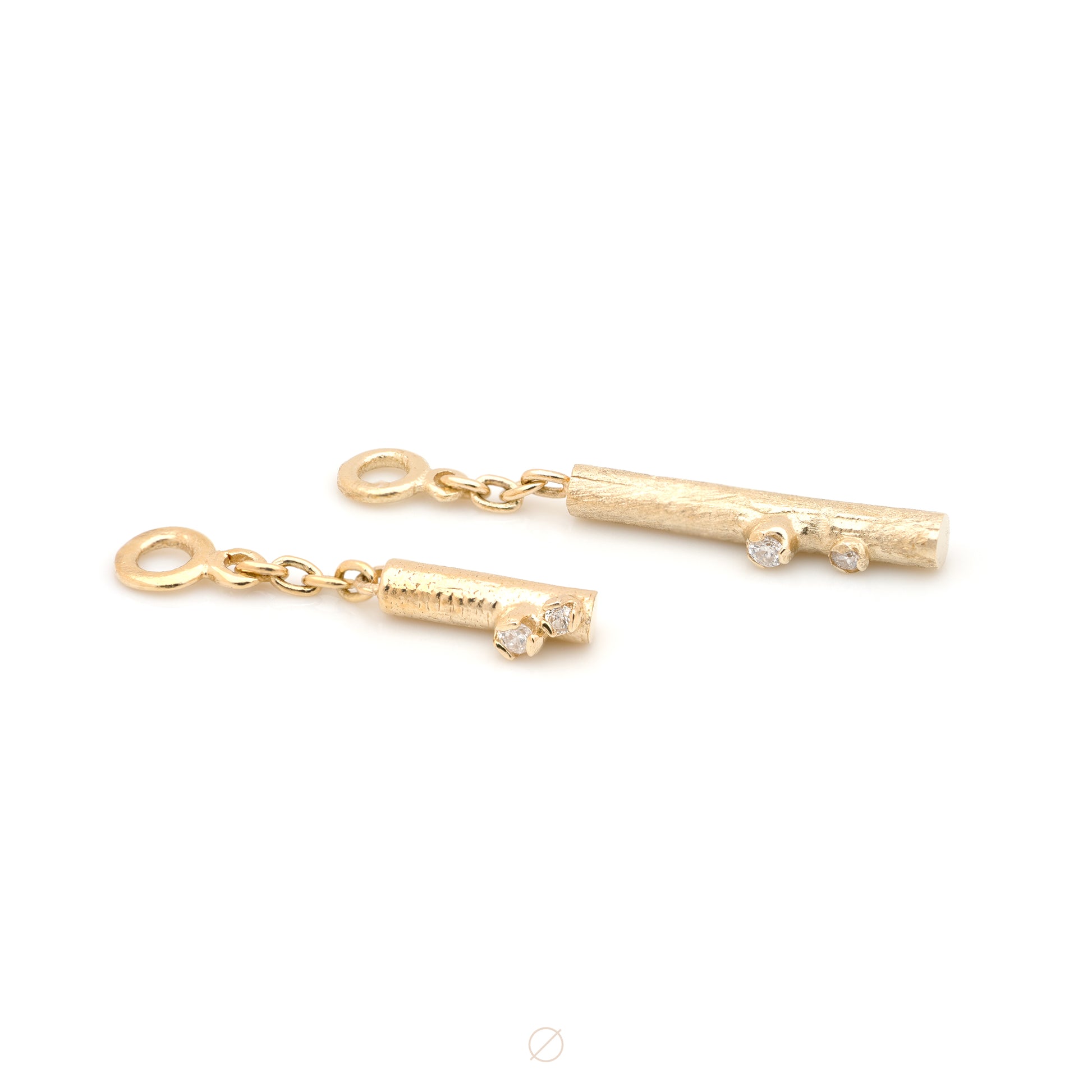 It drips! This beauty is marked with a gorgeous pair of diamonds and it is set in a dainty texturized bar of solid 14k yellow gold. Add this charm to your curated look to elevate your piercing game.
