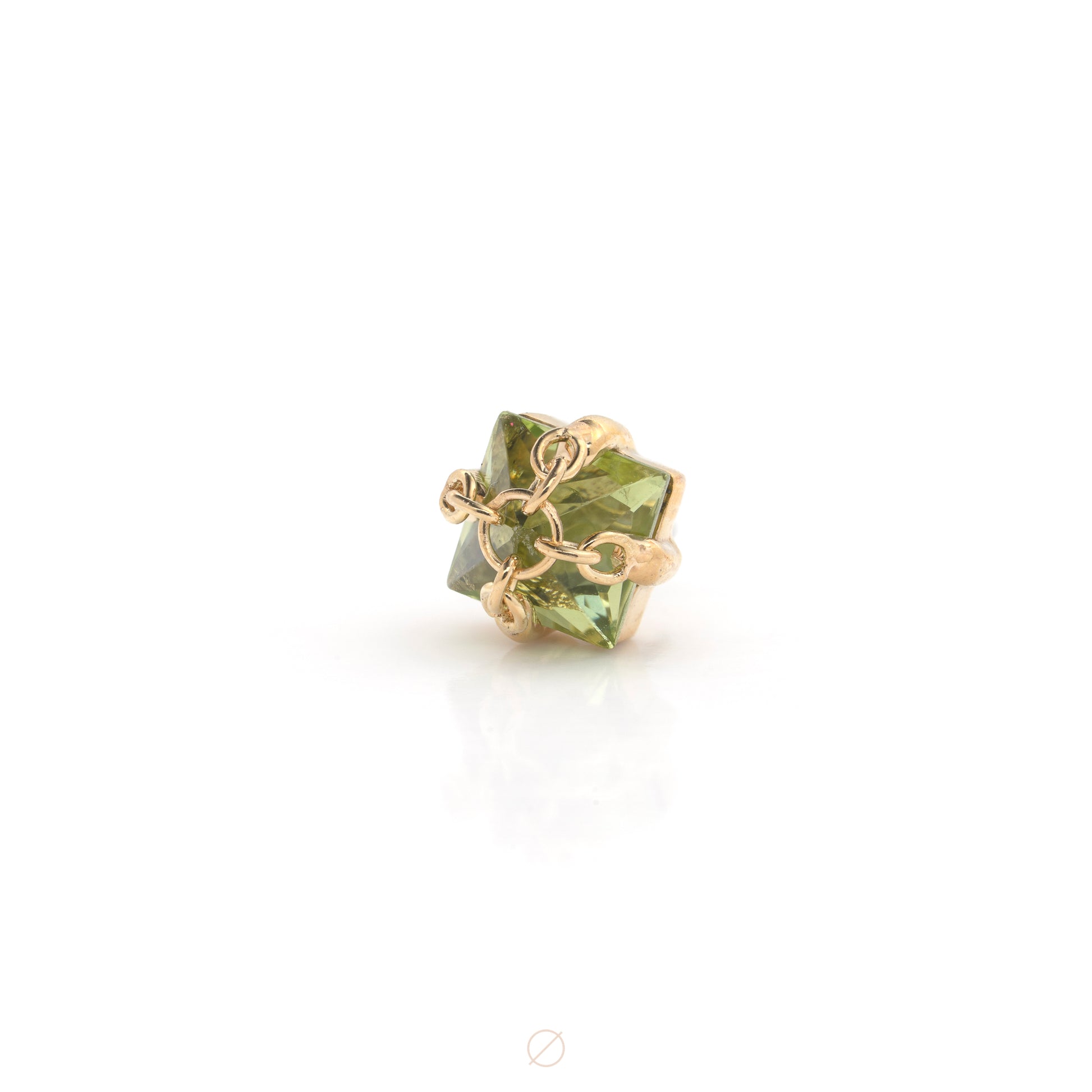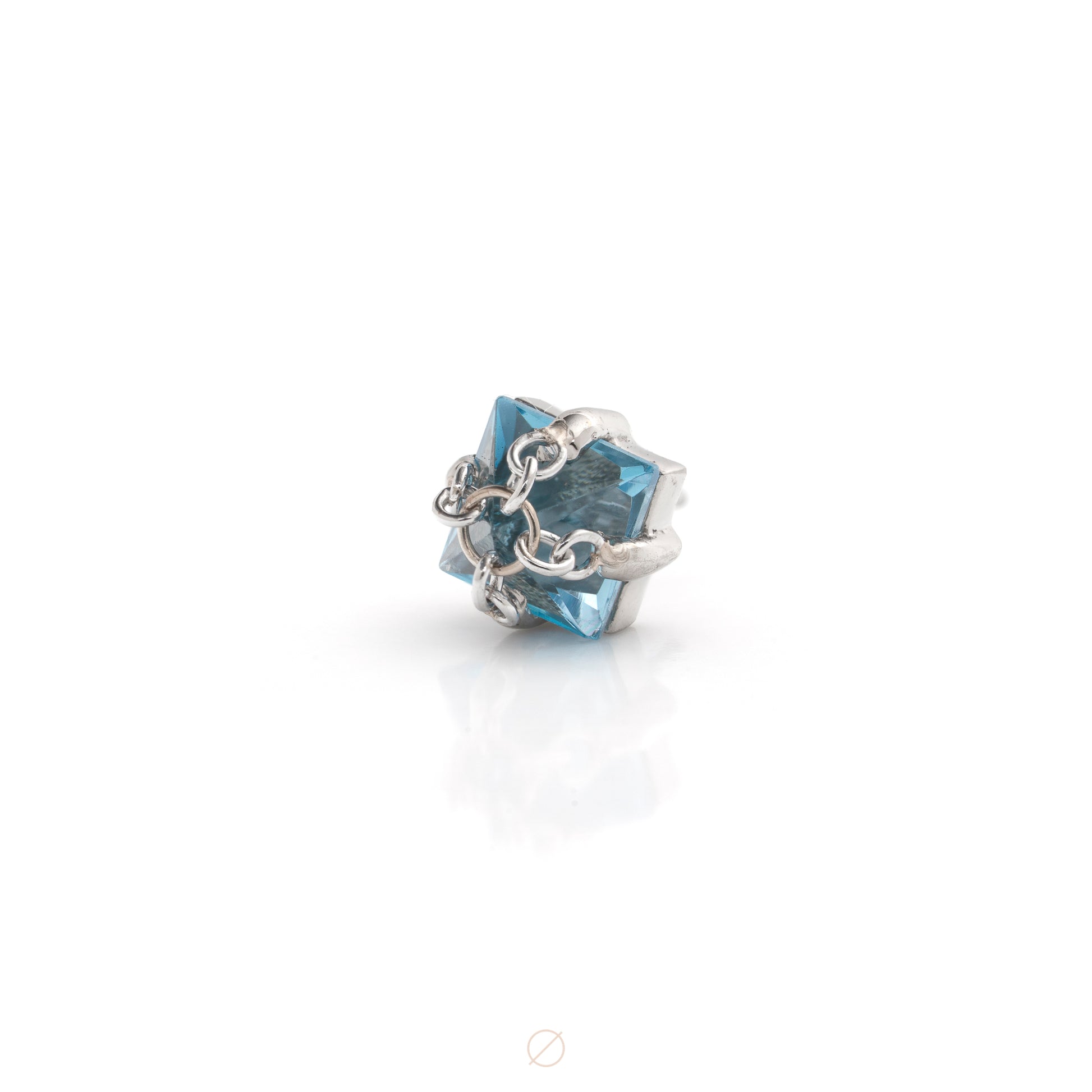 This daring piece packs some serious attitude. Breaking all the rules, this press-fit end features a natural stone set upside down which creates a spiky, edgy look and feel. The top of the stone is held by a ring that is attached via chains on 4 prongs.
